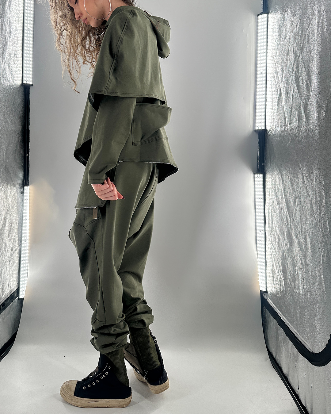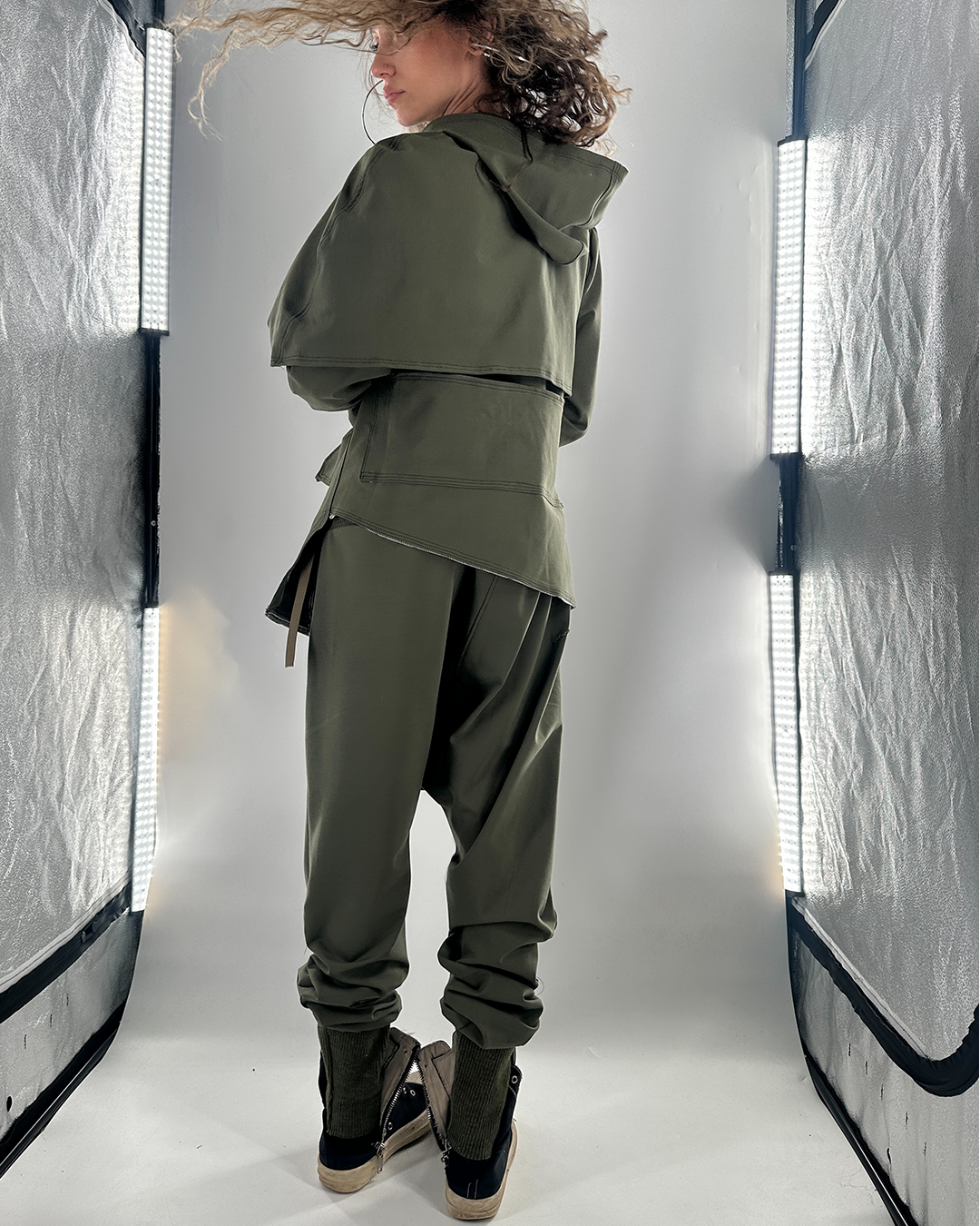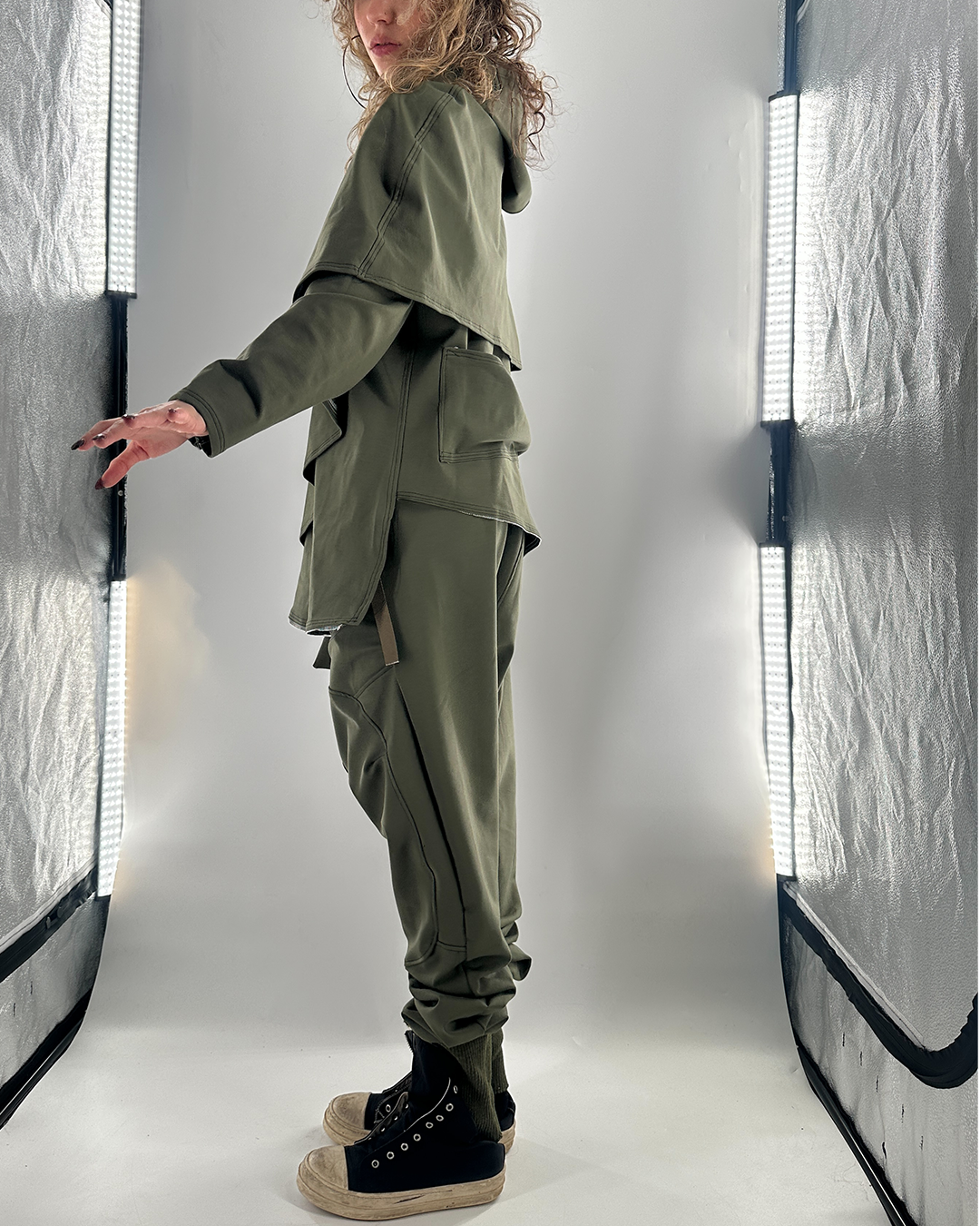 Structured Utility: Constructed in a durable, olive-green cotton-blend material, giving it the look of a structured jacket with the comfort of a sweatshirt.