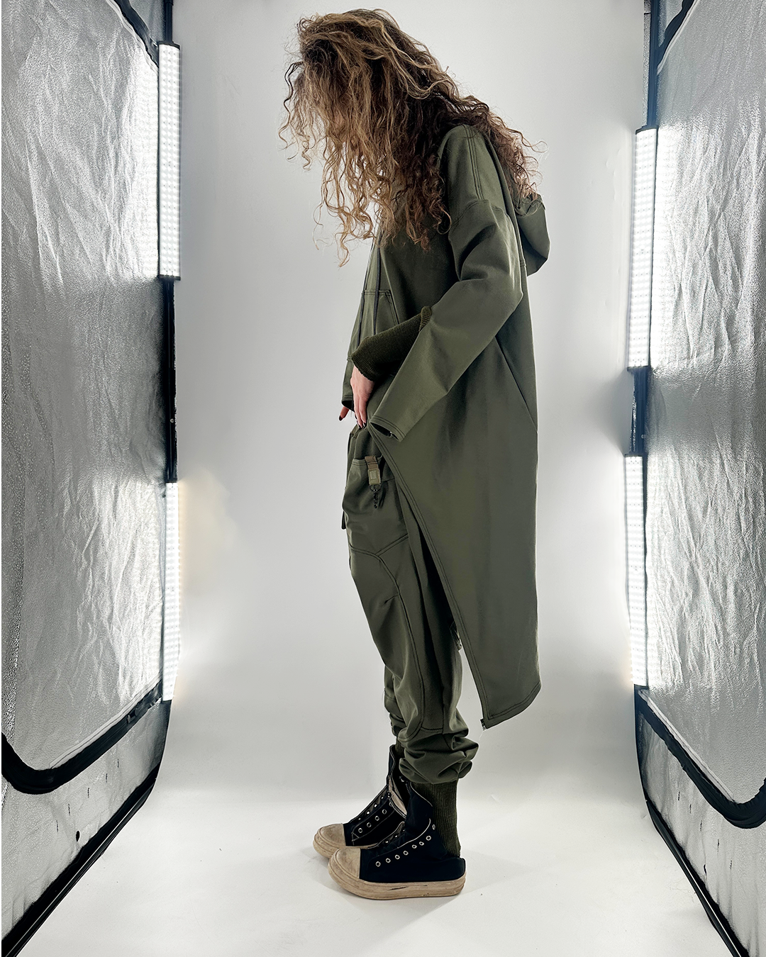 Contrasting Accents: Note the ribbed cuffs for a fitted wrist that balances the voluminous body.