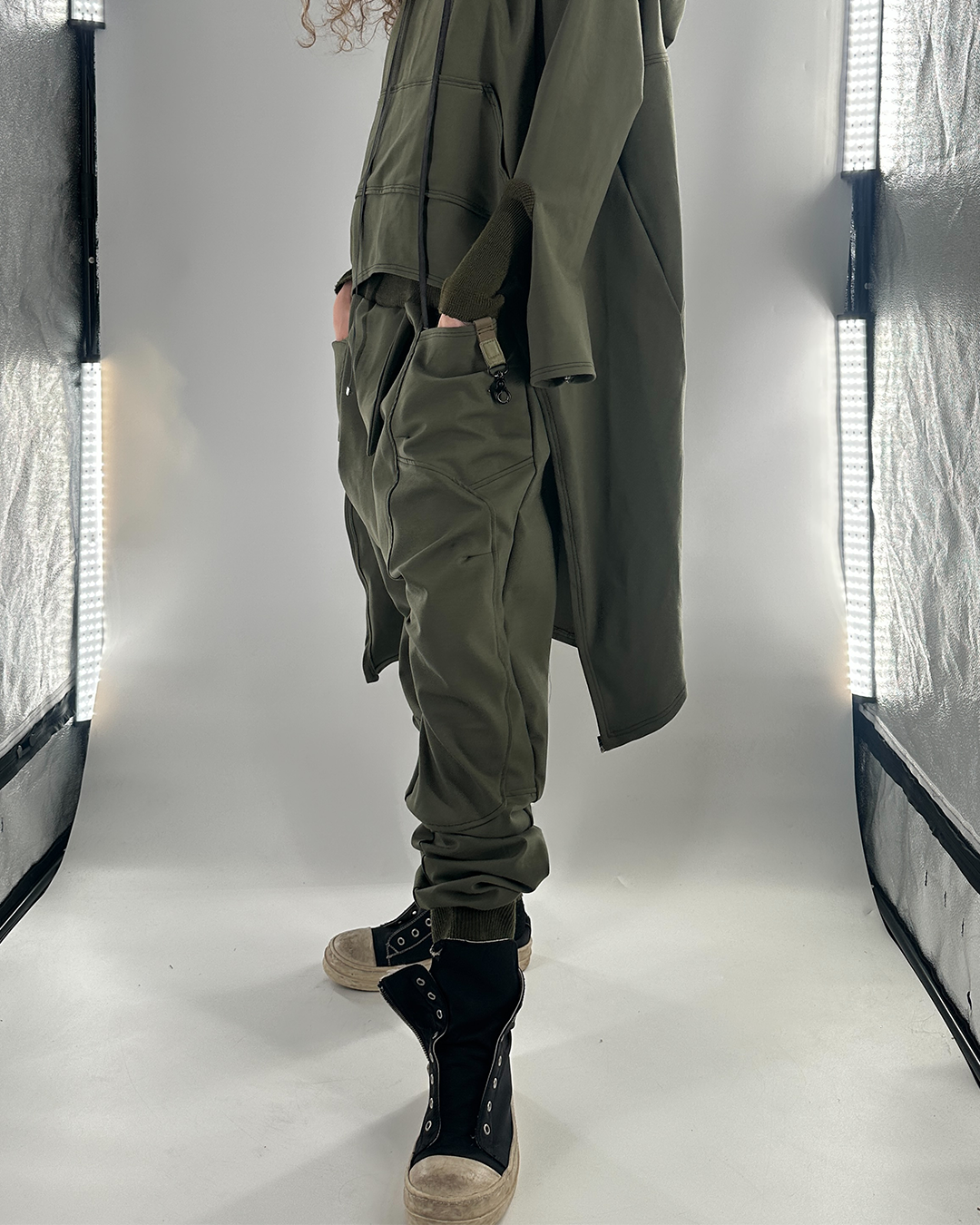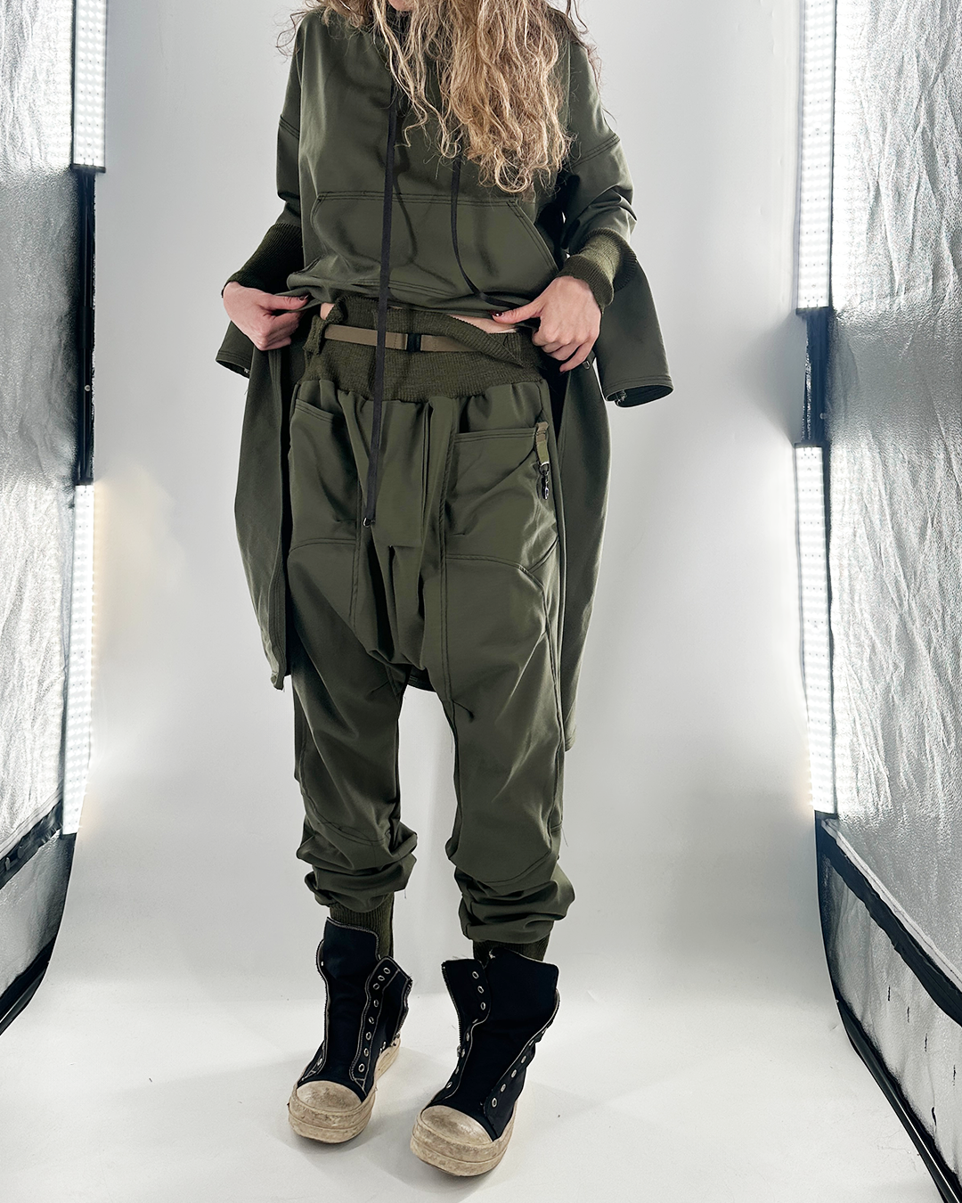 Techwear Utility: Crafted from a durable, olive green fabric offering structure, strech, and comfort.