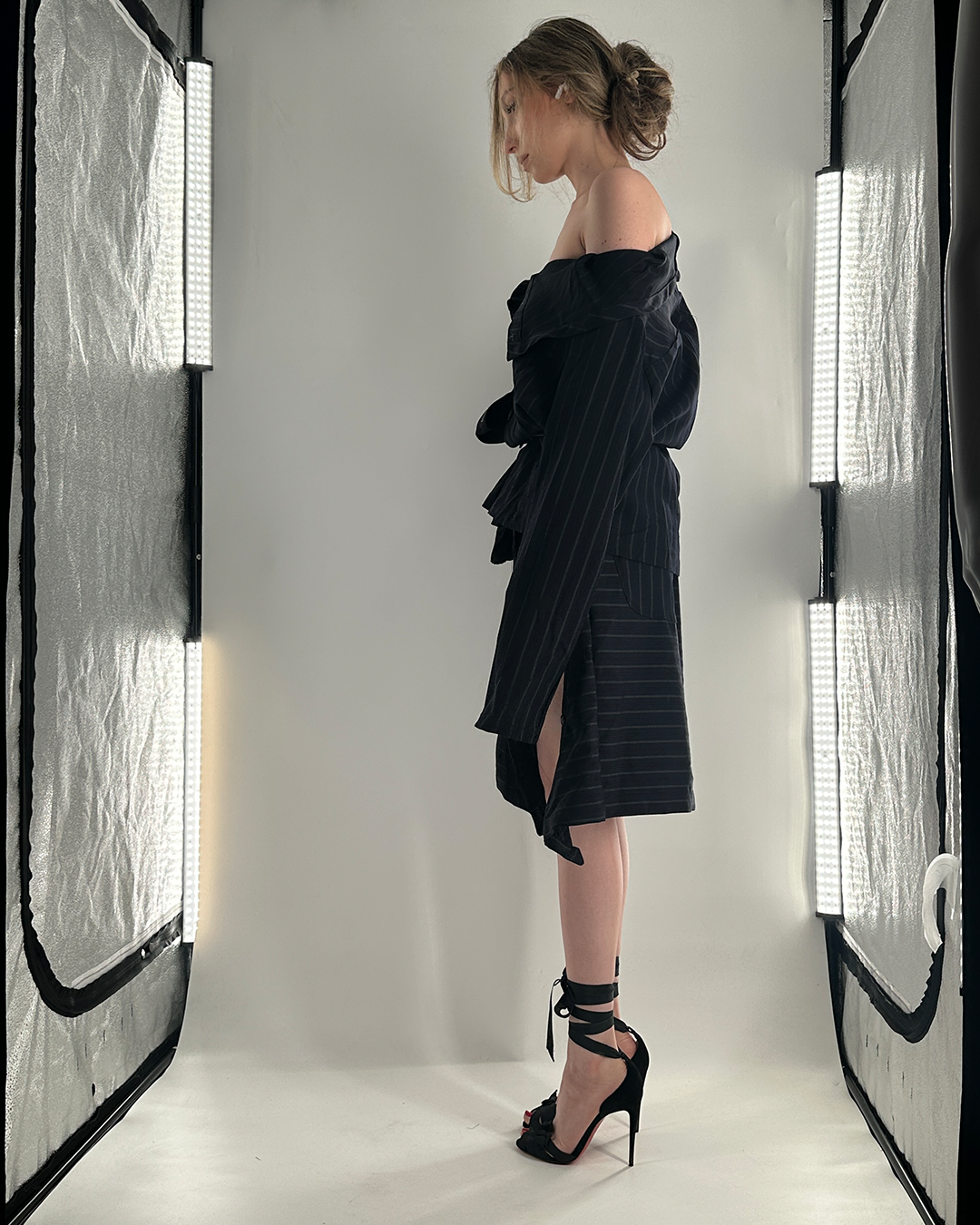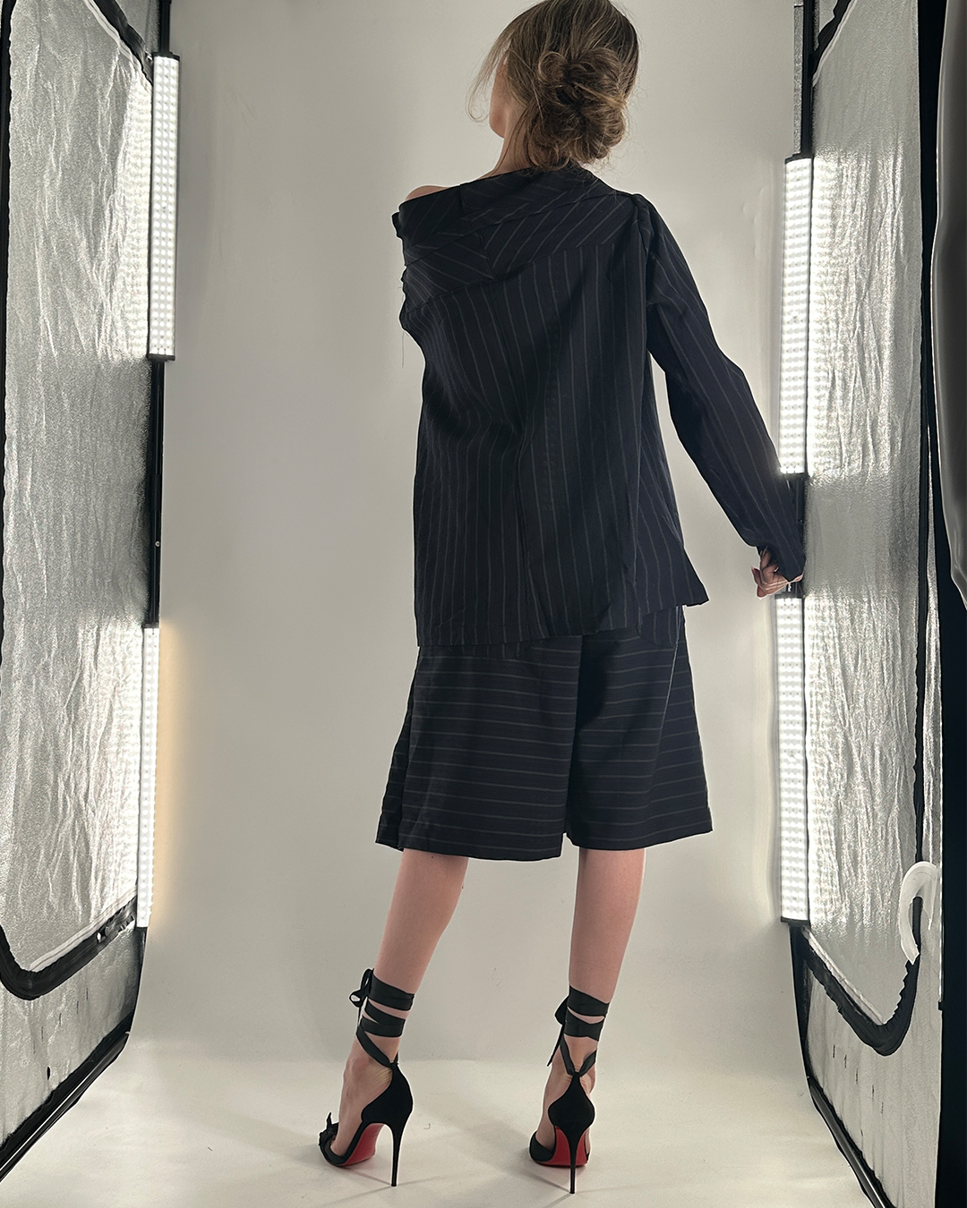 Key Features: Asymmetric cut, full-length button placket (collar to hem), oversized fit, classic pinstripe pattern.