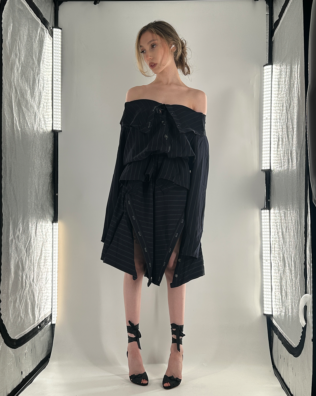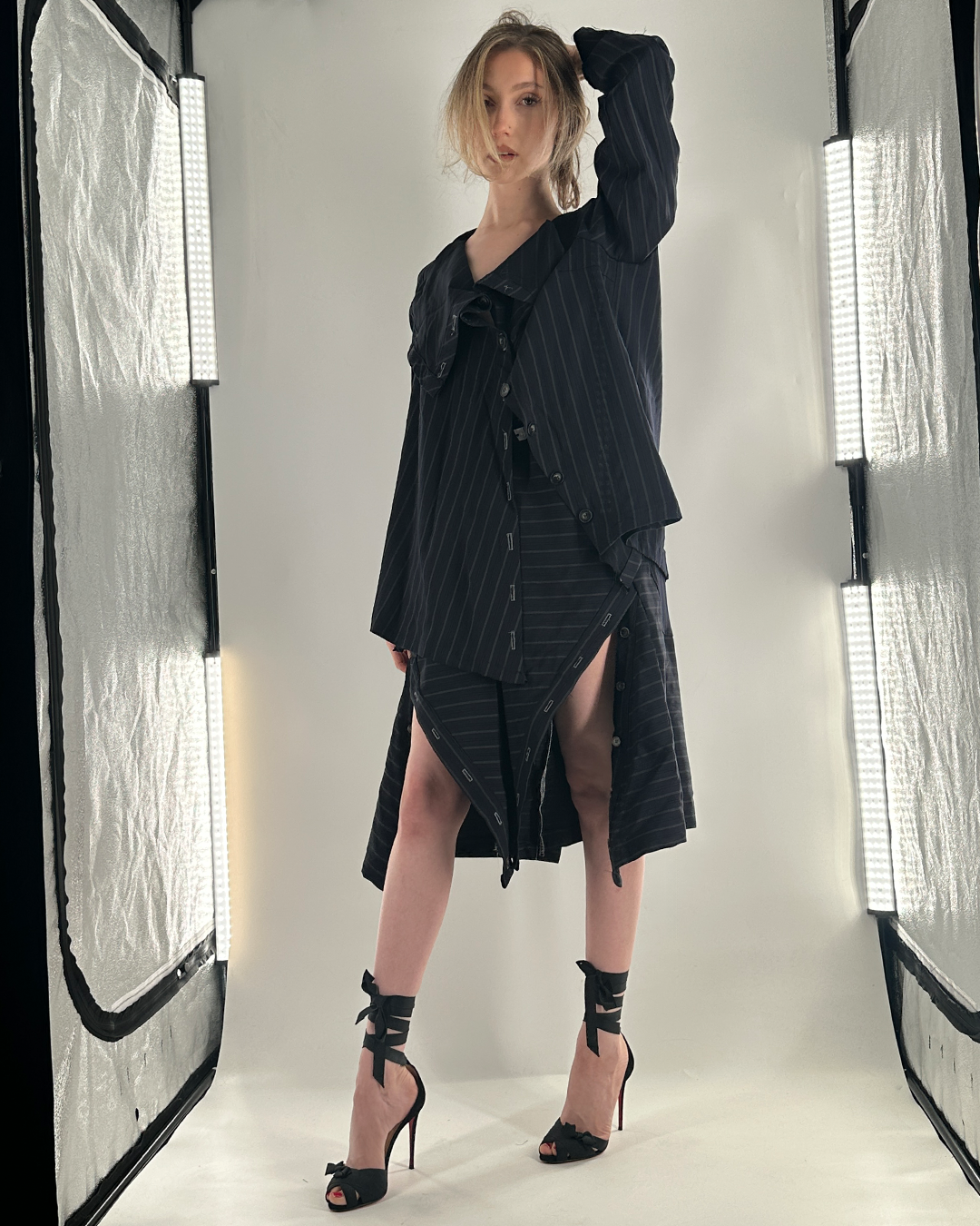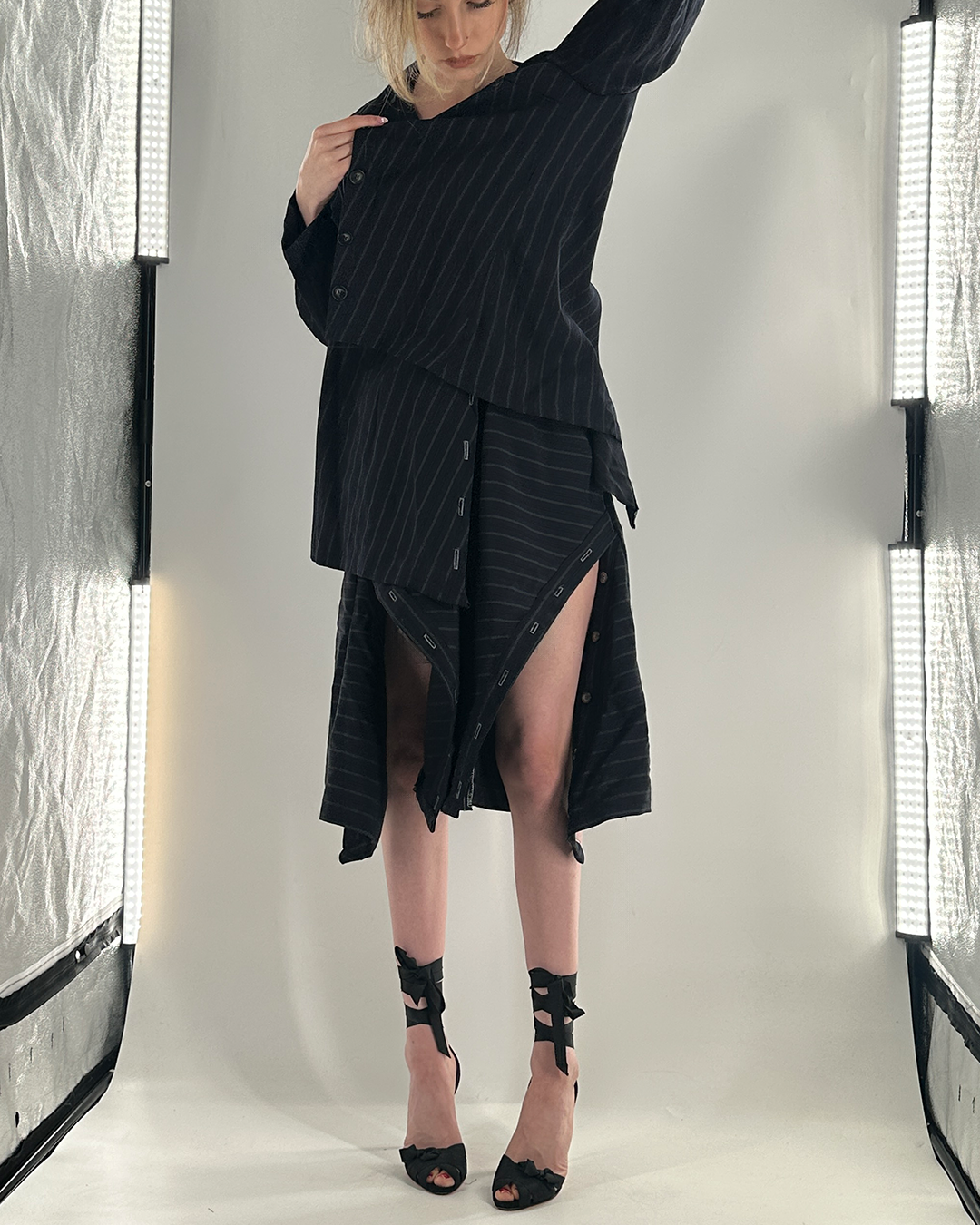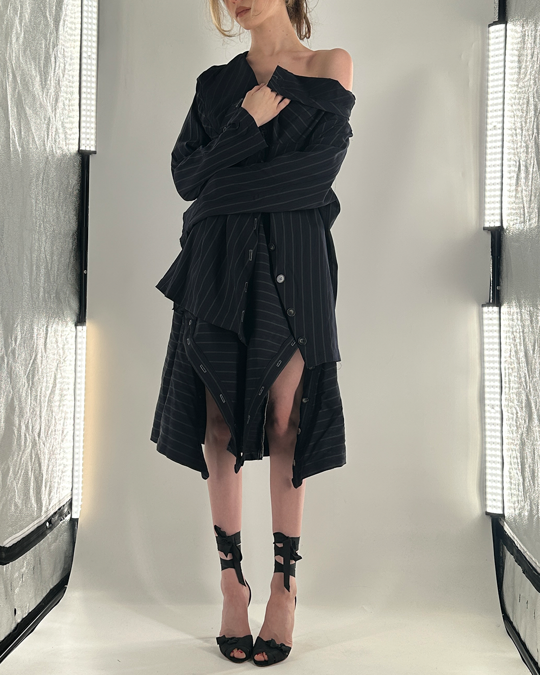 pinstripe shirting fabric, this piece challenges conventional structure with an oversized, asymmetric silhouette. The front features a dramatic cascade of buttons extending from the collar to the hem, offering versatile styling options—wear it open, partially buttoned, or layered.