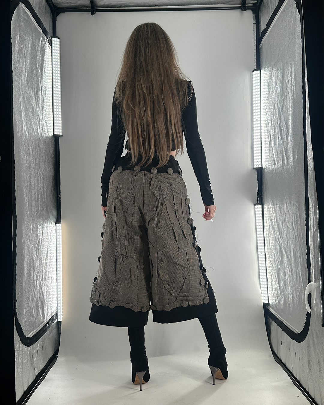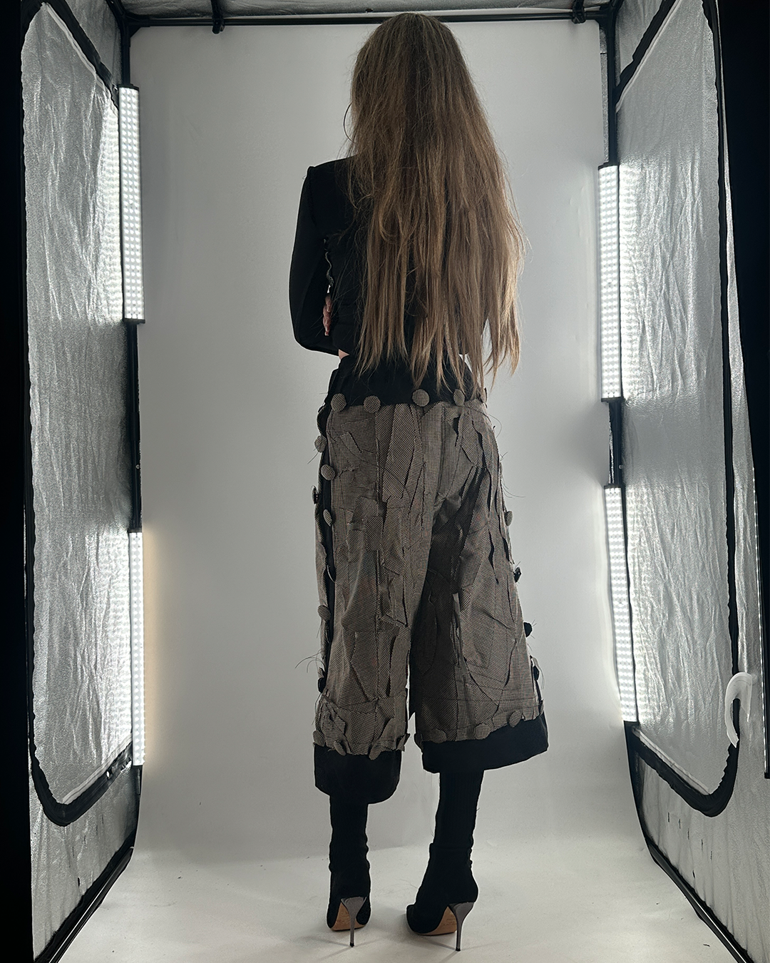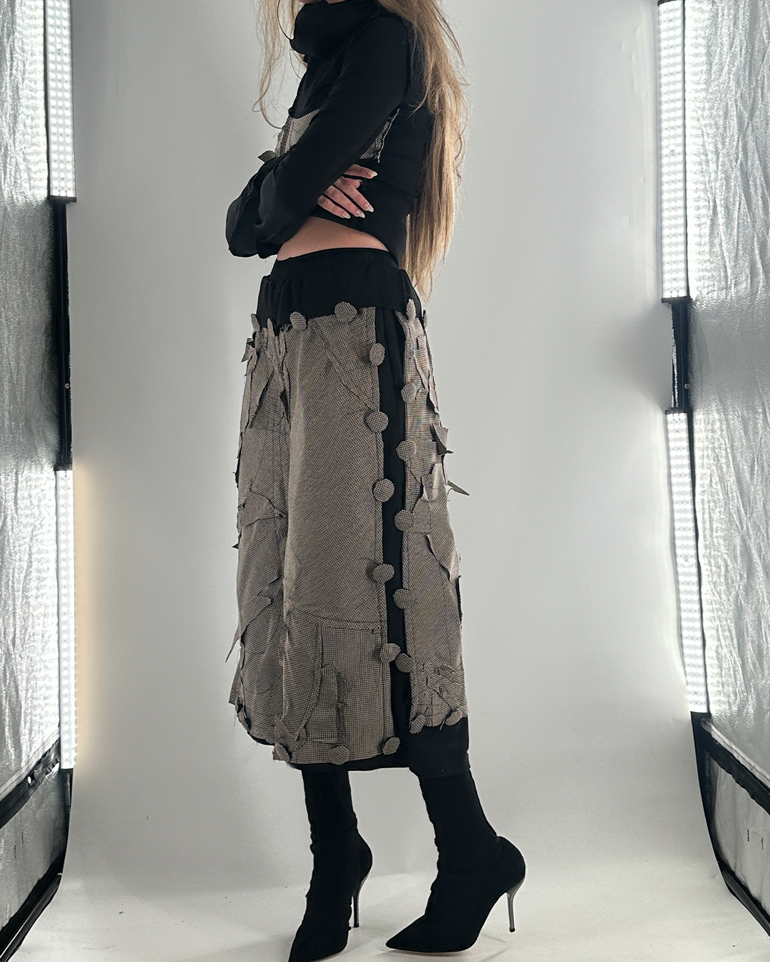 The pants are highly detailed with decorative, textured scrap panels stitched directly onto the garment, giving them a rich, deconstructed, and three-dimensional appearance. Finishing the design are statement dome-shaped buttons running vertically down the outer seams of the legs, adding a tailored yet avant-garde touch to the cozy foundation of the sweatpant.
