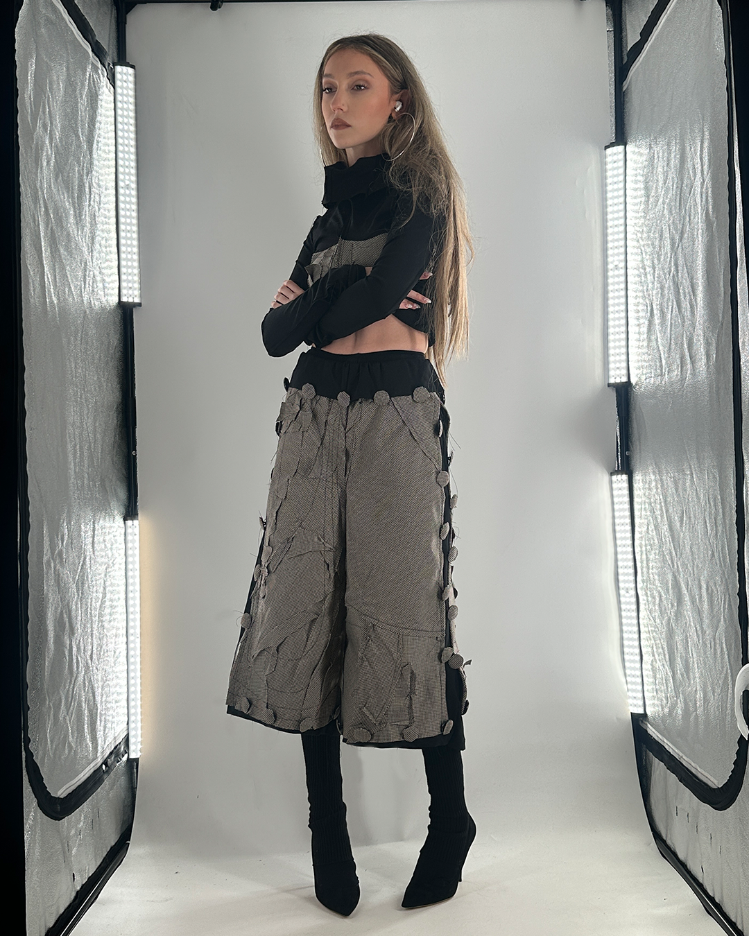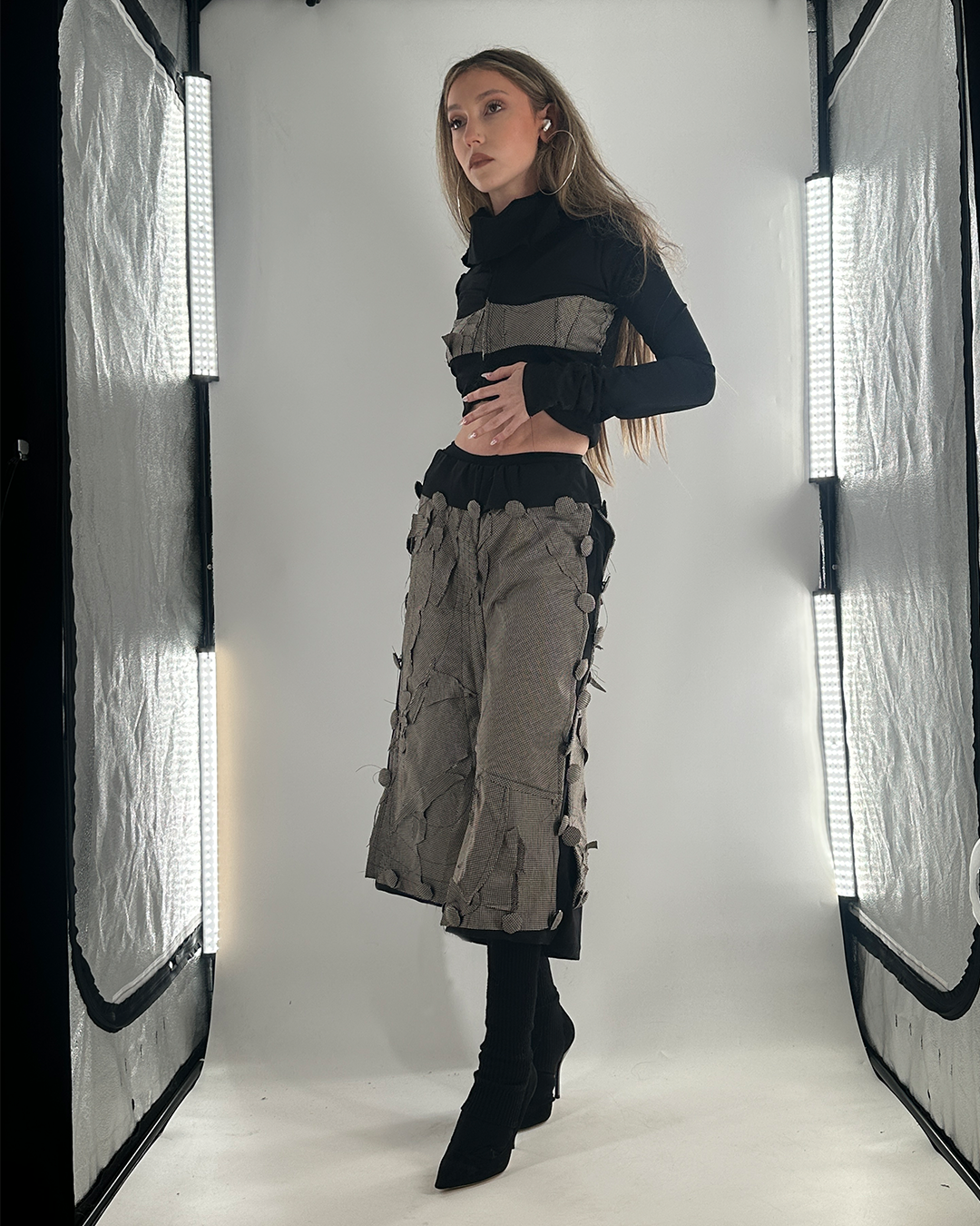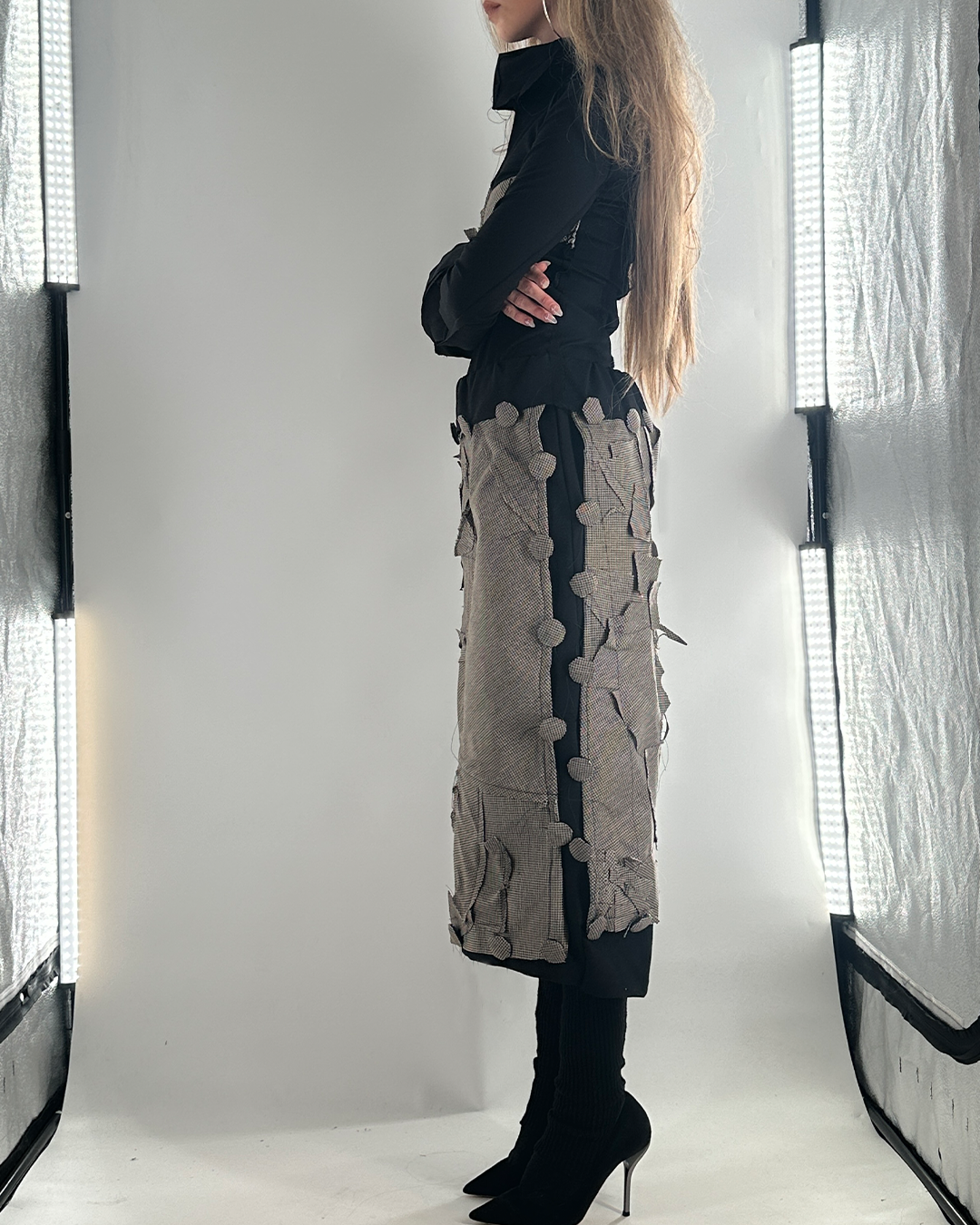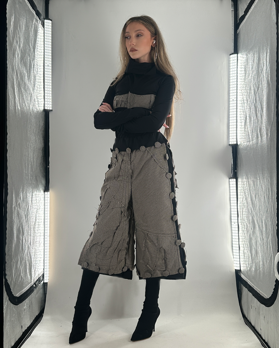 The pants are highly detailed with decorative, textured scrap panels stitched directly onto the garment, giving them a rich, deconstructed, and three-dimensional appearance. Finishing the design are statement dome-shaped buttons running vertically down the outer seams of the legs, adding a tailored yet avant-garde touch to the cozy foundation of the sweatpant.